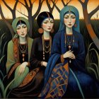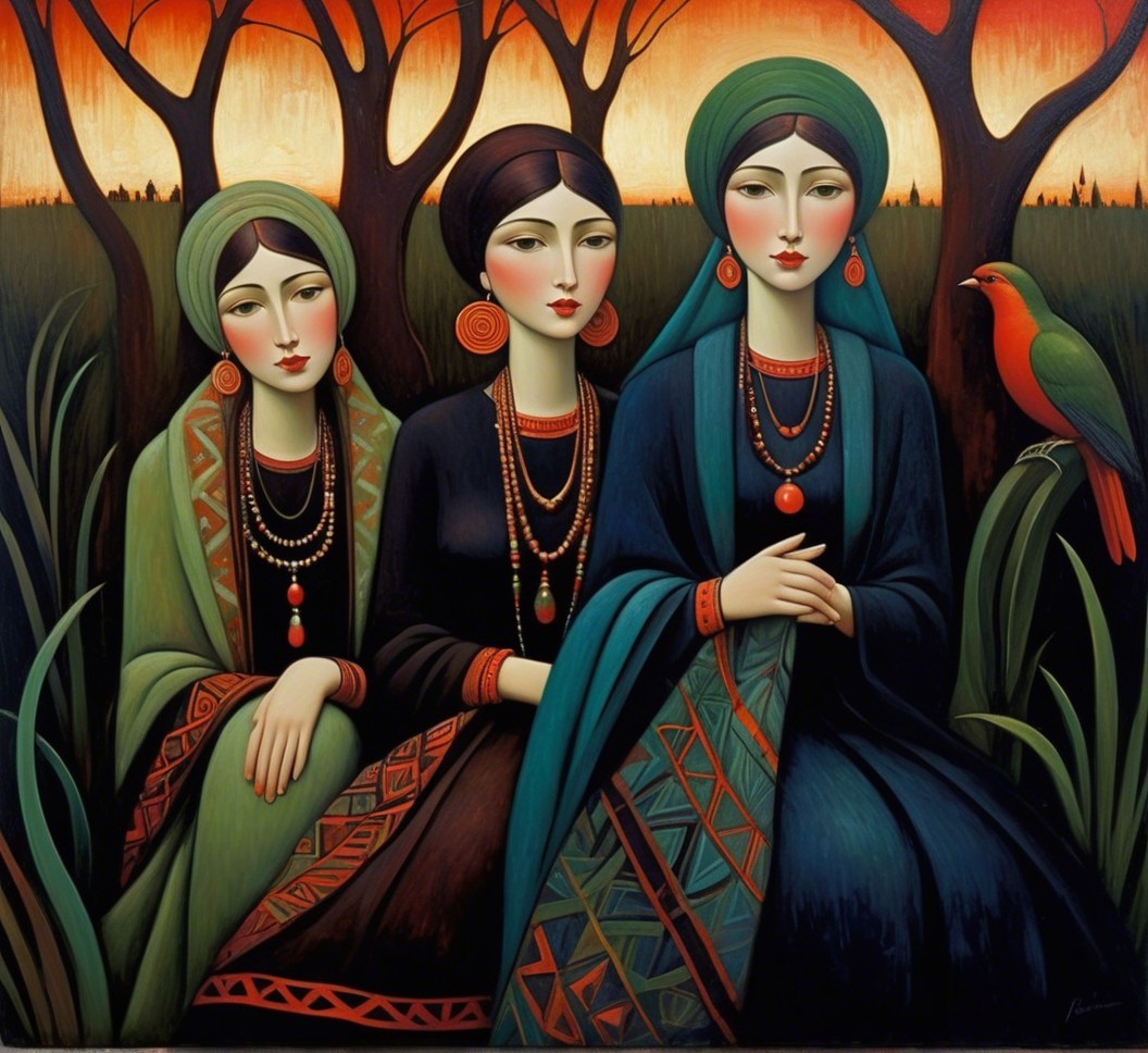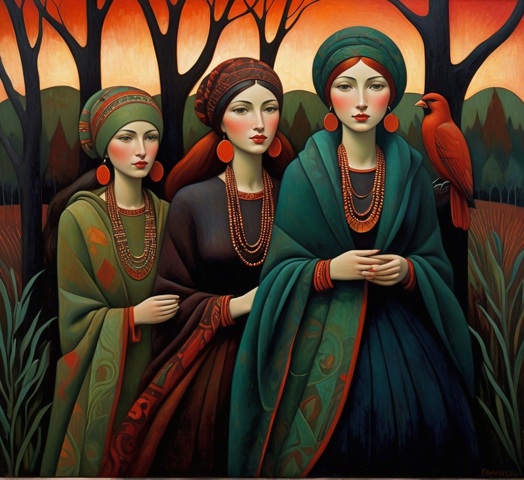 Three women dressed in traditional clothing adorned with large red earrings and beaded necklaces, standing closely together in a forest with dark, silhouette trees against an orange and red sky at sunset. The woman on the left wears green with brown patterns and a geometric patterned turban, holding hands with the middle woman. The middle