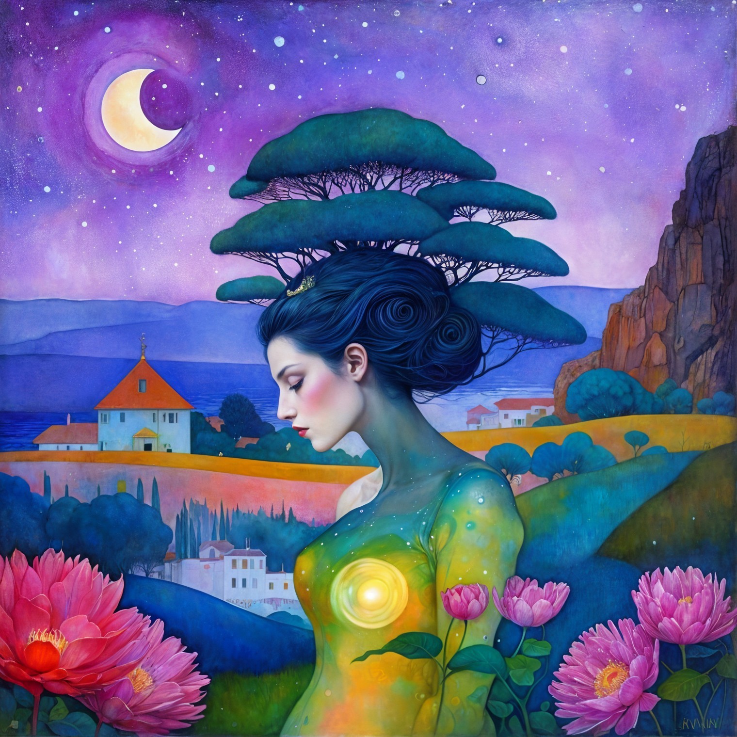 The artwork features a serene woman with vibrant colors, surrounded by flowers and trees. She gazes thoughtfully, set against a mystical landscape of hills, a sea, and a starry sky.