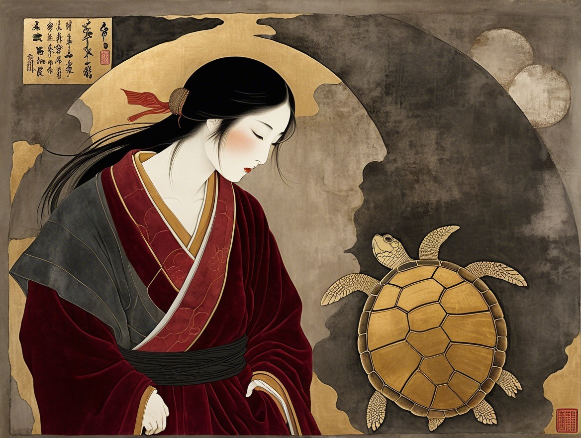 Legend of the Girl and the turtle , Medieval Japanese Artists Sumi-e Style, Velvet maroon, Shabby, Dull Gold, Amber Gray, . dramatic