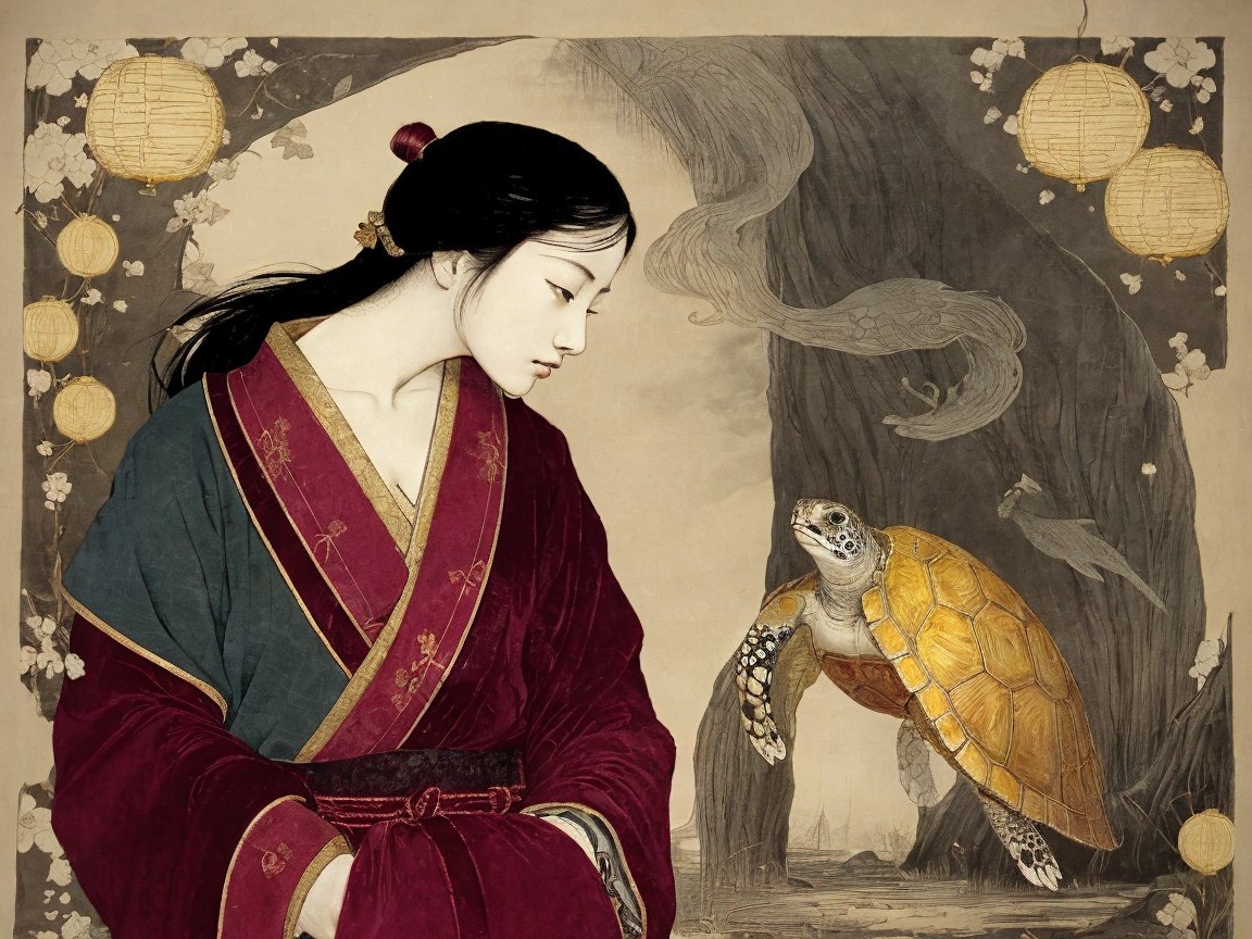 Prompt: "Legend of the Girl and the turtle , Medieval Japanese Artists Sumi-e Style, Velvet maroon, Shabby, Dull Gold, Amber Gray, . dramatic