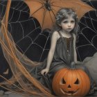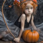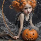 A young girl with orange hair, dressed as a fairy in a black outfit, sits beside a carved pumpkin. Her wings are made of delicate spiderwebs, creating a whimsical Halloween vibe.