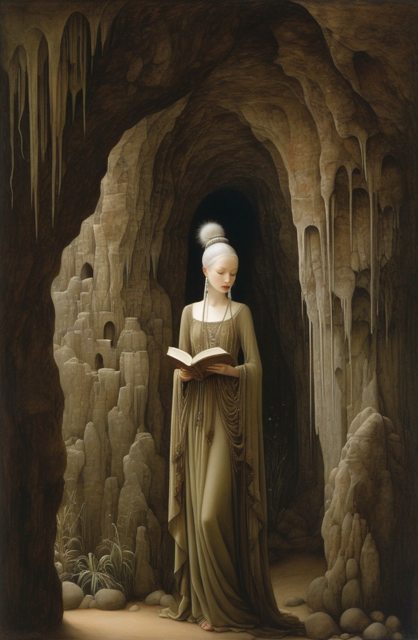 Ethereal figures in gossamer robes reading books by tranquil waters