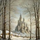 A serene landscape features a majestic castle atop a hill, surrounded by ethereal trees and calm waters. A crescent moon hangs in a soft sky, while small boats drift peacefully below.
