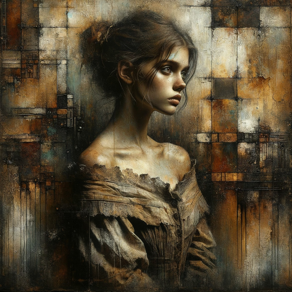 Prompt: "Enigmatic young maiden with introspective gaze, lost in thought, clad in tattered, earth-toned attire, set against a distressed industrial backdrop of exposed brick, rusty metallic accents, and peeling paint, with vertical streaks of grime and decay. The dark color palette blends muted blacks, warm golds, and earthy tones, evoking a sense of melancholy and introspection. Inspired by the dramatic lighting of Pino Daeni, the surreal, industrial landscapes of Zdislaw Beksinski, and the sensual, mystical qualities of Luis Royo. Rendered in a mix of oil and ink on canvas, with layered textures, fragmented elements, and bold brushstrokes, invoking the emotional intensity and moodiness of German Expressionism."