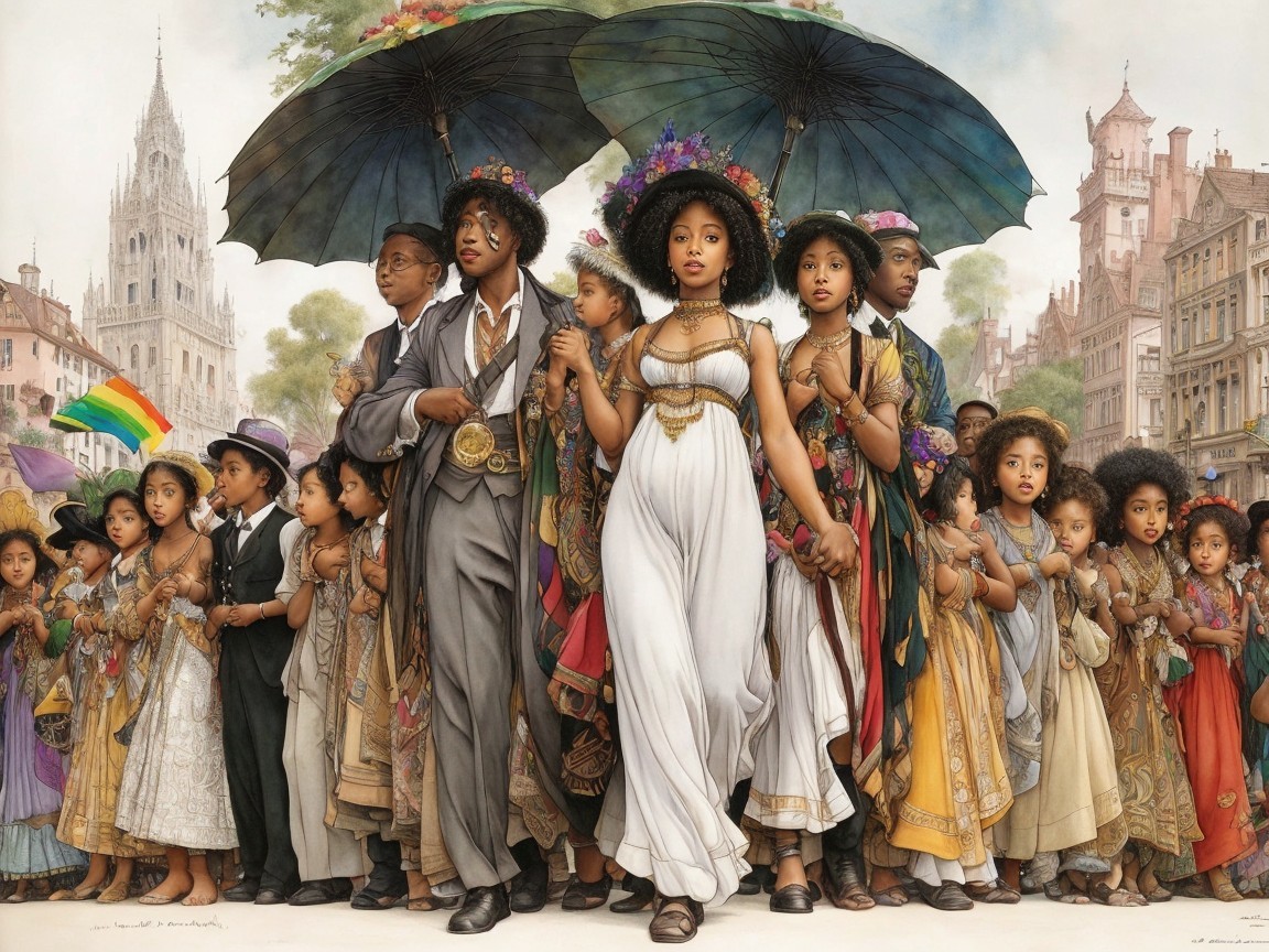 The image depicts a vibrant historical parade featuring elegantly dressed individuals, including a couple with umbrellas leading a diverse group of children and adults, celebrating unity and culture.