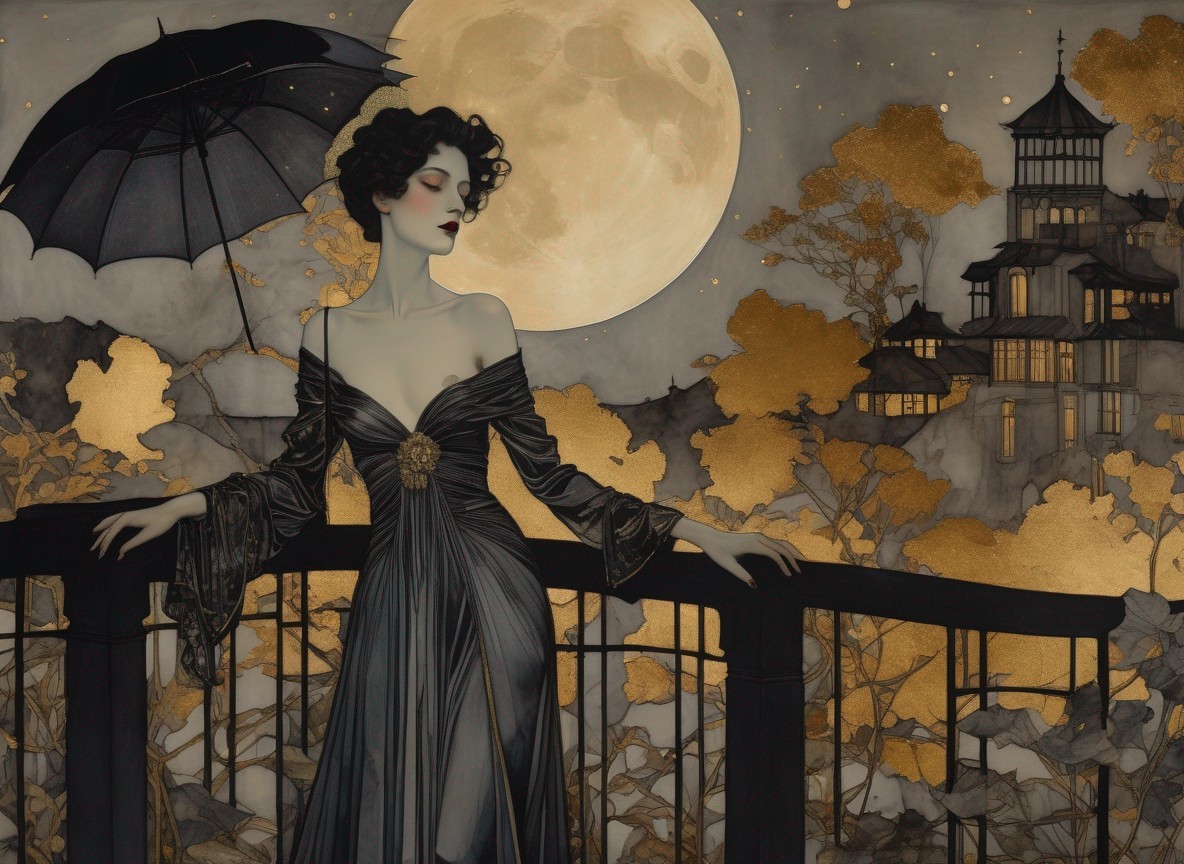 Woman in Dark Dress Among Gold-Leafed Trees and Moon