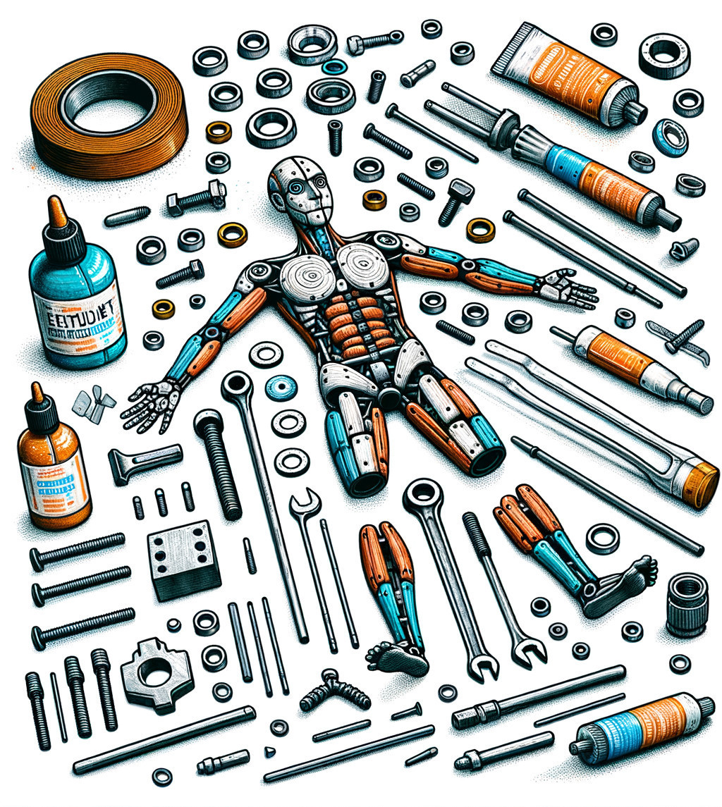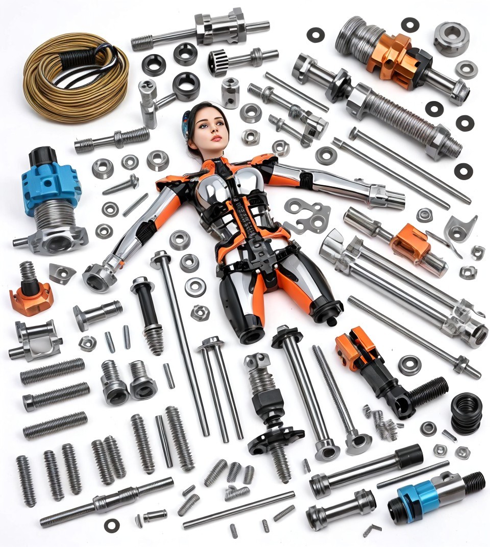Prompt: "A woman girl in separate pieces and parts, ready to assemble with bolts and screw and glue, a woman body kit for do it yourself DIY enthusiasts to build themselves from parts, lovely cute, drawing hand sketch color, uncanny humor"