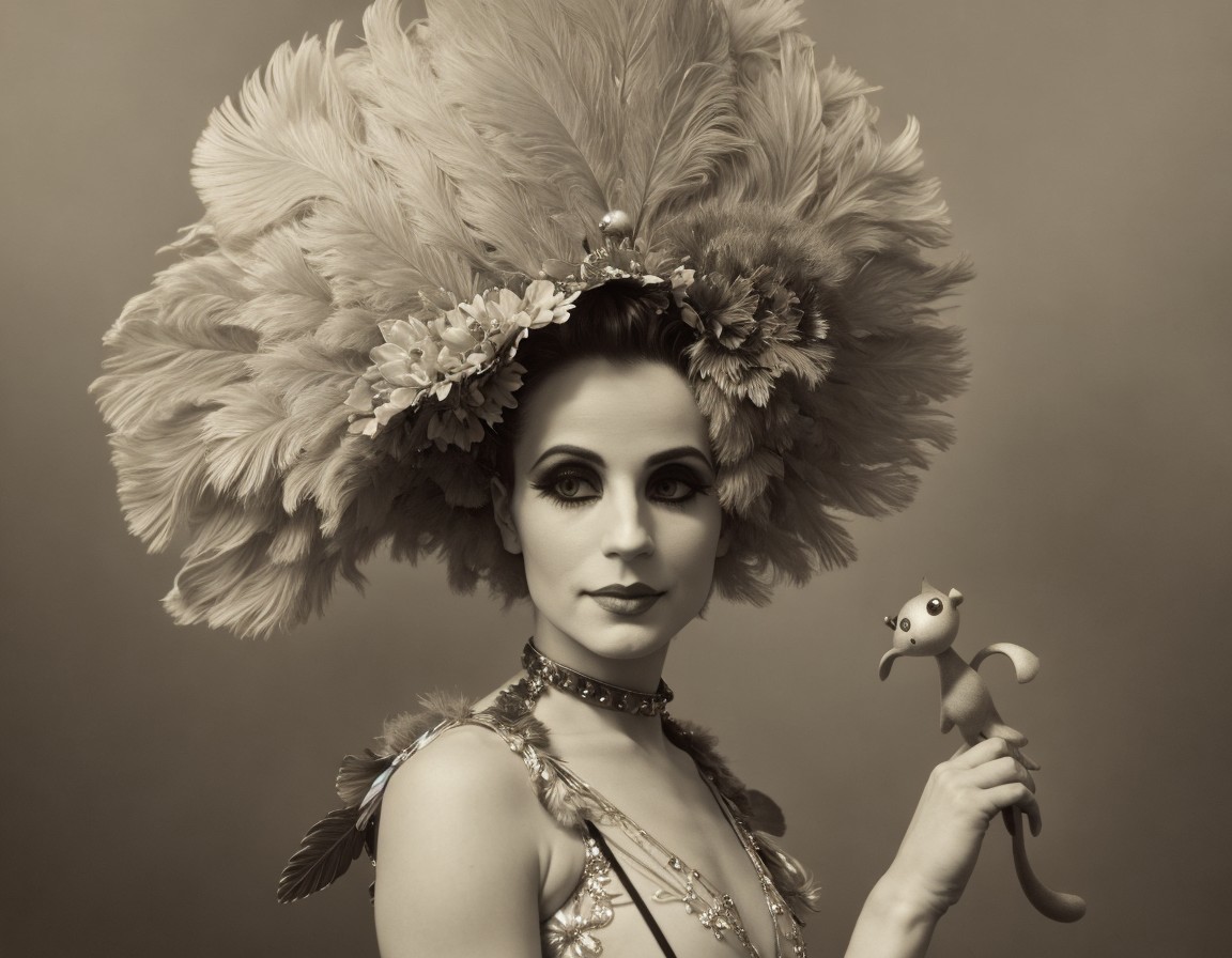 A monochrome image of a woman with a large ornate fan headpiece, vintage makeup, and a bird perched on her finger.