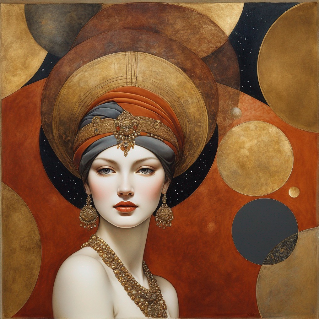 An artwork depicting a woman with a serene expression, adorned in ornate golden jewelry and a headdress with celestial spheres.