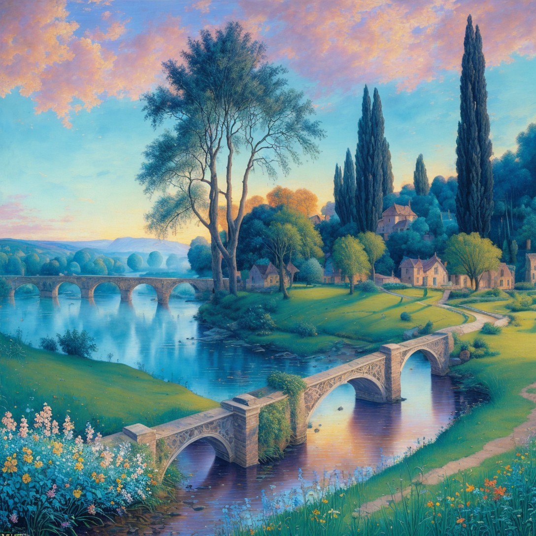 A serene landscape with a stone bridge over a river, quaint houses, and lush trees during dusk or dawn, reflecting calmness and beauty.