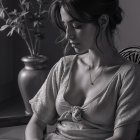 A young woman sits thoughtfully in an elegant armchair, wearing a soft, knotted dress. The muted, natural light highlights her serene expression amid a cozy, inviting interior.