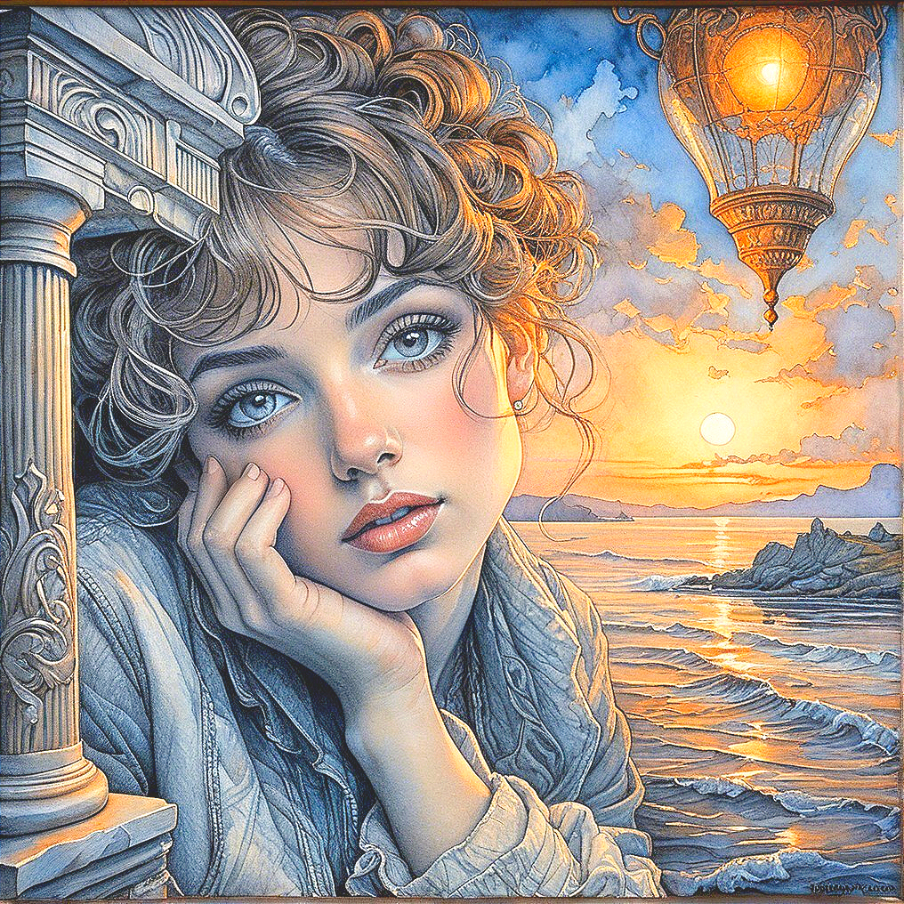 A dreamy portrait of a young woman with curly hair, gazing thoughtfully. She is framed by a lantern and a serene sunset over the ocean, creating a magical and tranquil atmosphere.