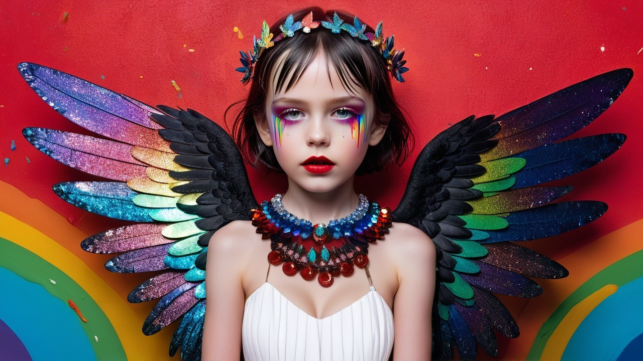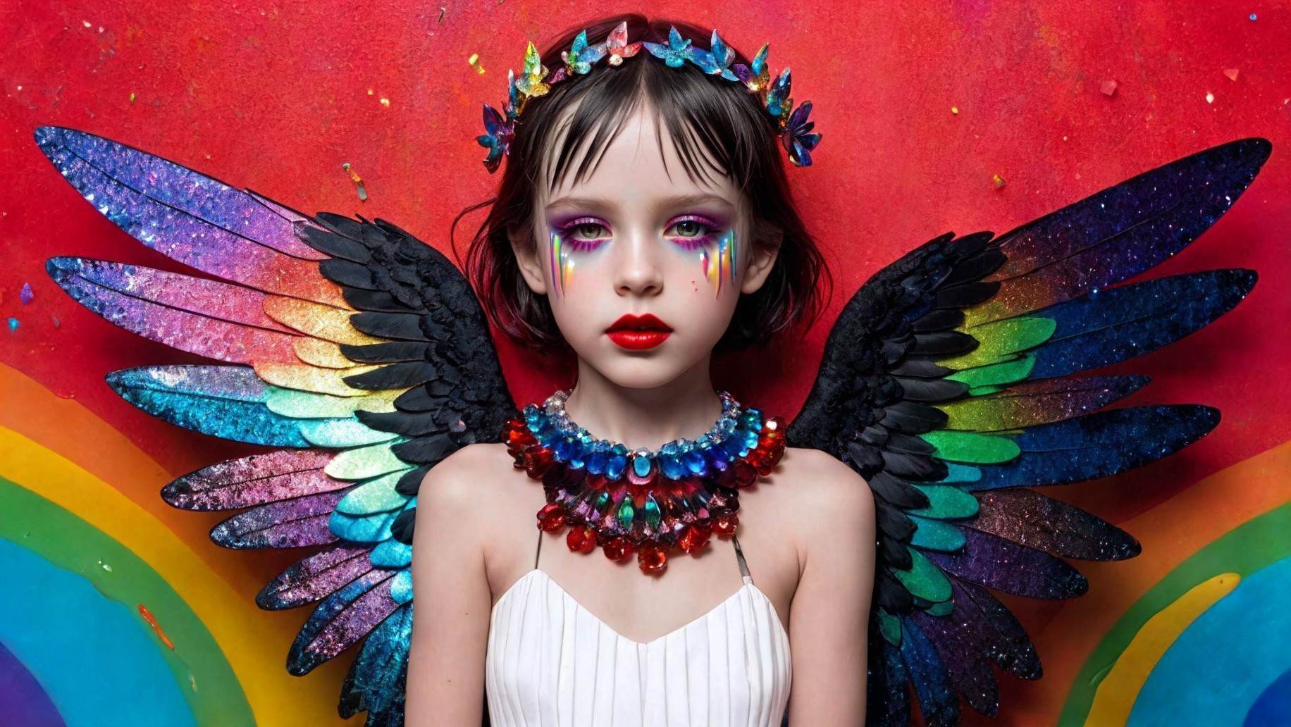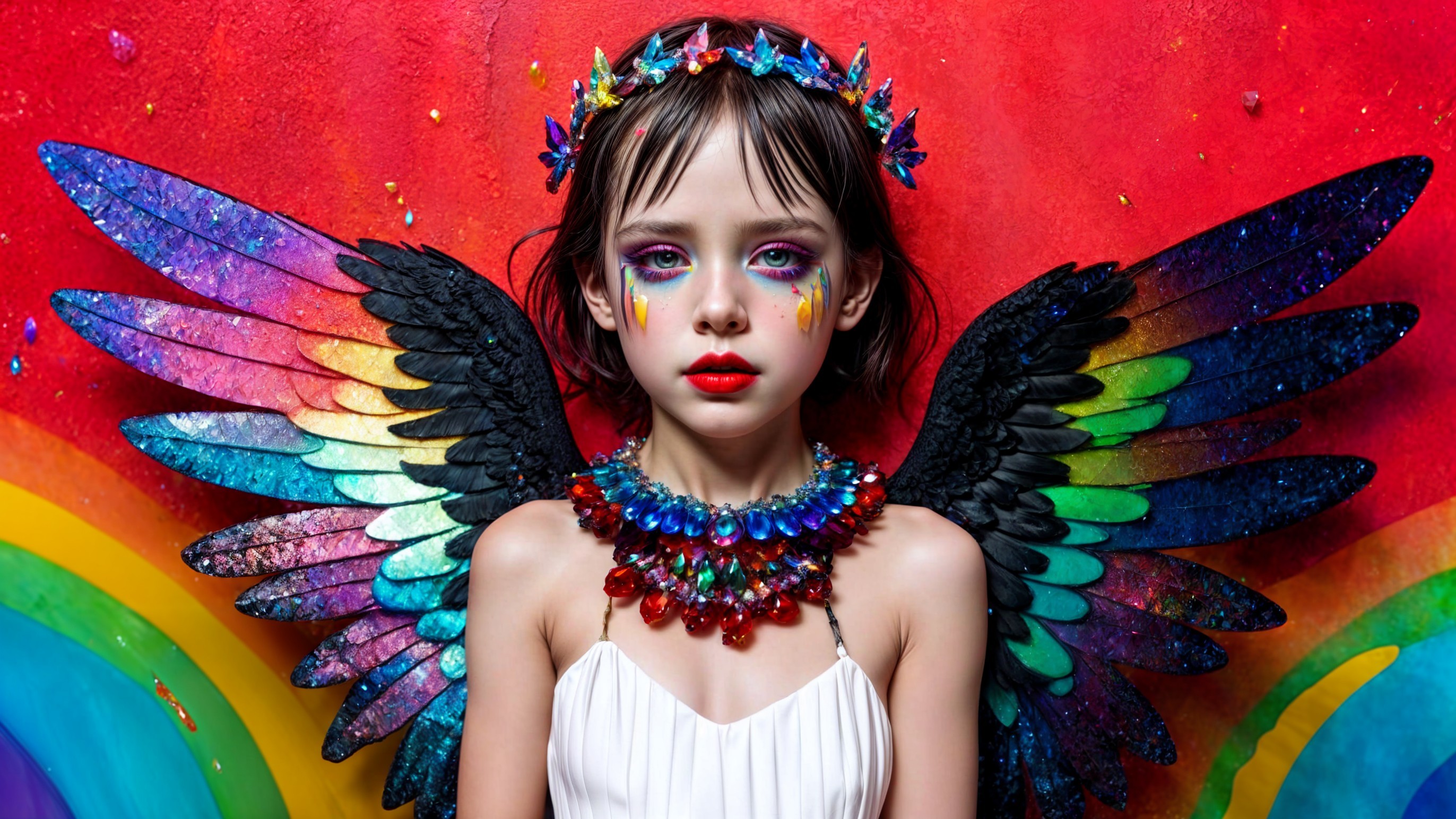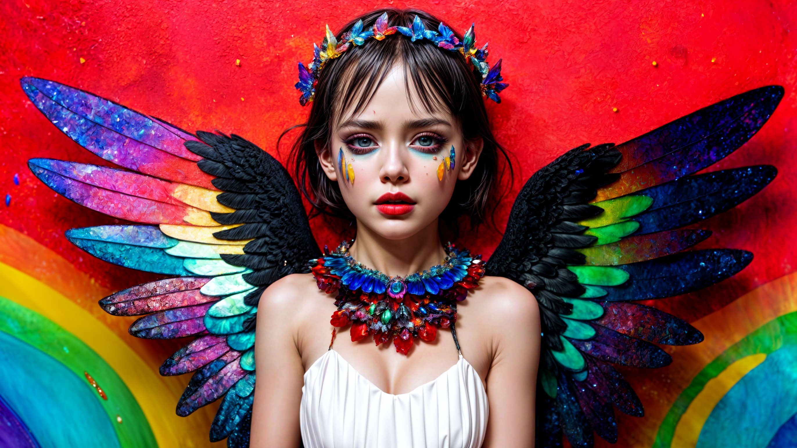 A young woman with vibrant, colorful wings stands against a bold red and rainbow background. She wears a floral crown and a shimmering necklace, exuding a whimsical, enchanting aura.