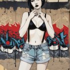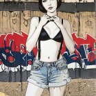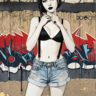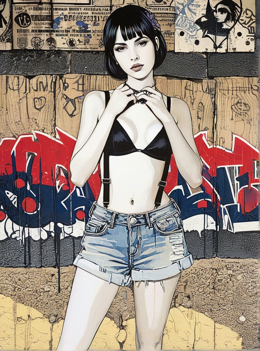 Prompt: Gothic-inspired woodblock print featuring a stylized portrait with a juvenile essence, whimsical ink painting, young gothic-rock female in front of wall with graffitti tags, sharp outlines that intricately define a Gothic maiden with a surreal twist, fishnet, blue jeans, reminiscent of woodcut-inspired graphics, modernist fissured hues in a plique-à-jour technique, focused, the figure emerges from the mosaic-style, background, stylized, dynamic lighting effects, subsurface scattering 1.9, dyed, brightness 1.3, complex color scheme, parallax occlusion 1.3, background with stencils, airbrush technique in style of Man Ray, colorful yam, warm coloring, sprayed watercoloring reminiscence, hyper-maximalism, soft rounded edges, alcoholic aquatint merged with psychosomatic undertones, modernist flair, contoured, line-art, high coloring, pop art details by Ho Baron. 3D textures, phong shading 1.8, parallax occlusion 1.4, debeh, bokeh, vfx, stacked lines, tetradic color scheme of light-grey lamaranth-red auburn and metallic honey, plasticity 1.9, diffused llghting and reflections, precise gelsculpt 64k, 3d effects, uhd, hdr, vfx-inspired, hues by Man Ray, micro-pen lineage, small brushstrokes for intricate line-art details, zentangle, psychedelic Woodblock Print, precise gelsculpt 64k, textured skin by William Bradley, LiDAR point cloud, anisotropic filtering 1.3, texture mapping 1.3, Novelty architecture, sawtooth wave, overall composition by Ed Emshwiller and Stan Lee and Wiliam Turner. Stippled, blotted, cel-shaded, visible textures. Stylzed portrait in mysticalscene, 3 point lighting, brightness 1.3, zentangle, plasticity 1.1, warm toned ethereal glow, reminiscent of autumn academia, vibrant, magical atmosphere, linocut merged with collagrapy, whimsical, surreal, juminocore elements, dreamlike setting, intricate linework, detailed linocut textures, collagraphy elements, stylized with micro-pen lines, warm tones, layered textures, fragmented painterly style with heavy brushstrokes by Brandon Mably, hand-drawn illustration style, irregular strokes, blotting, unique, crisp quality.
