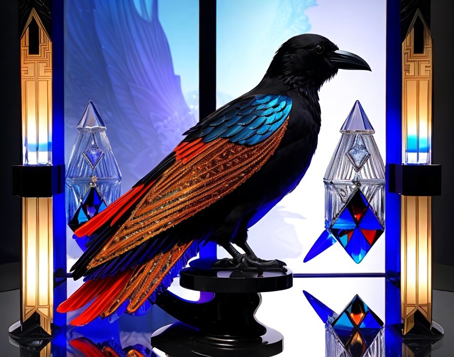 Prompt: "black crow, intricate chest made of Gade floating in the ocean, blue beautiful sky in retrospect, Chinese Crystals, Art Deco, Deep Rich Triadic Colors, Lalique Glass, style of Flamenco, highly detailed."