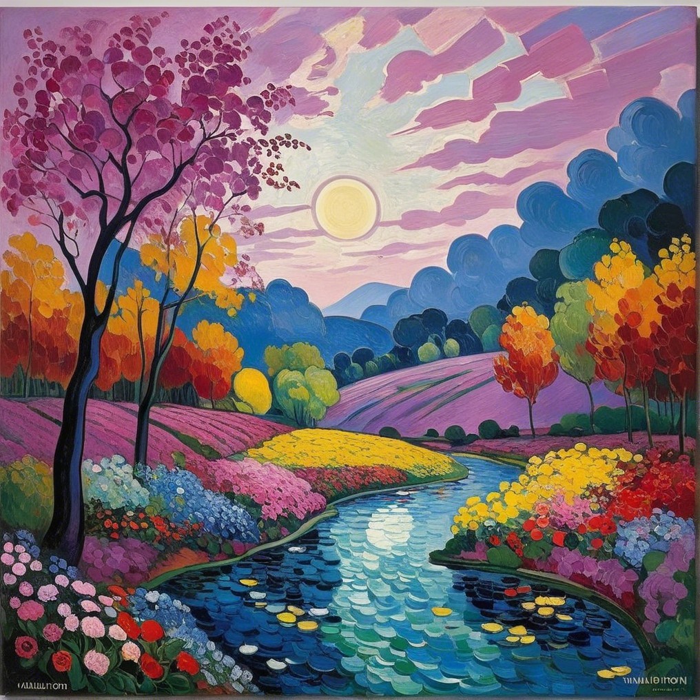A vibrant landscape featuring colorful flowers and trees in various autumn hues, with a winding river reflecting the pastel sky and the sun setting behind distant mountains.