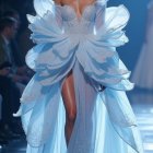 A model walks the runway in a stunning light blue gown featuring floral embellishments and a flowing train. The background is filled with an audience captivated by the fashion show.