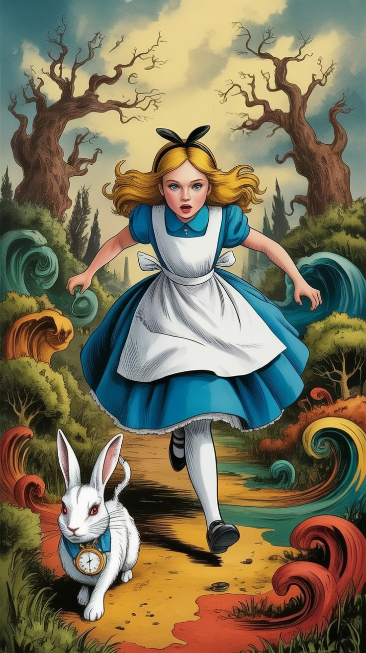 A young girl in a blue dress with a white apron runs down a winding path, accompanied by a white rabbit wearing a pocket watch, amidst whimsical, colorful swirls and twisted trees.