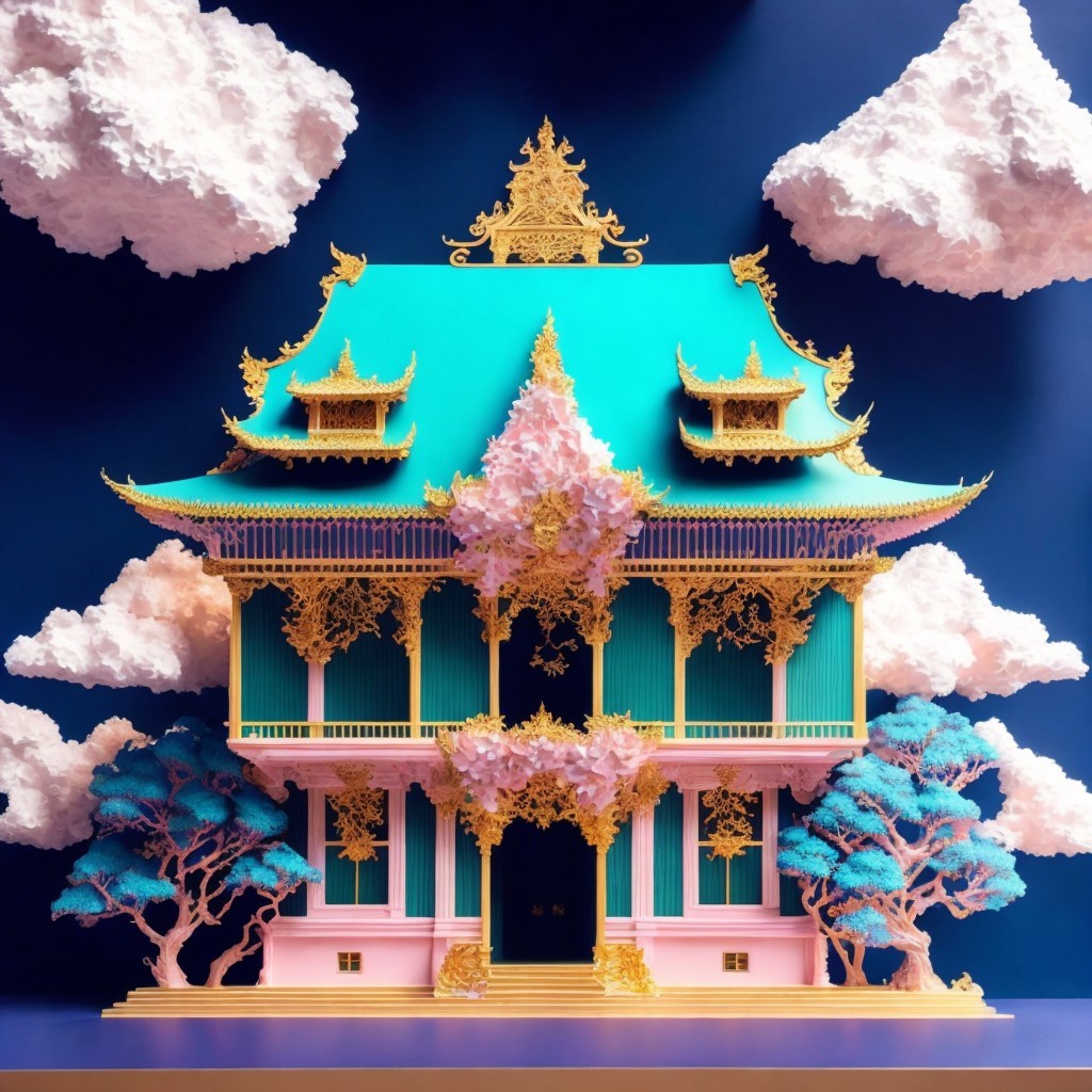 Asian temple illustration with golden accents and pink trees on teal backdrop