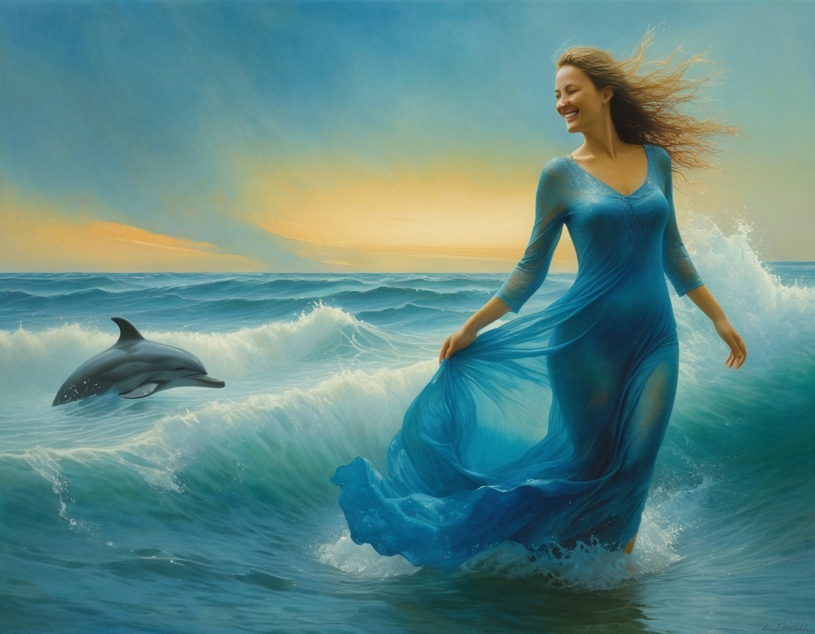 A joyful woman in a flowing blue dress stands in the sea, smiling at a leaping dolphin against a backdrop of waves and a serene sky.