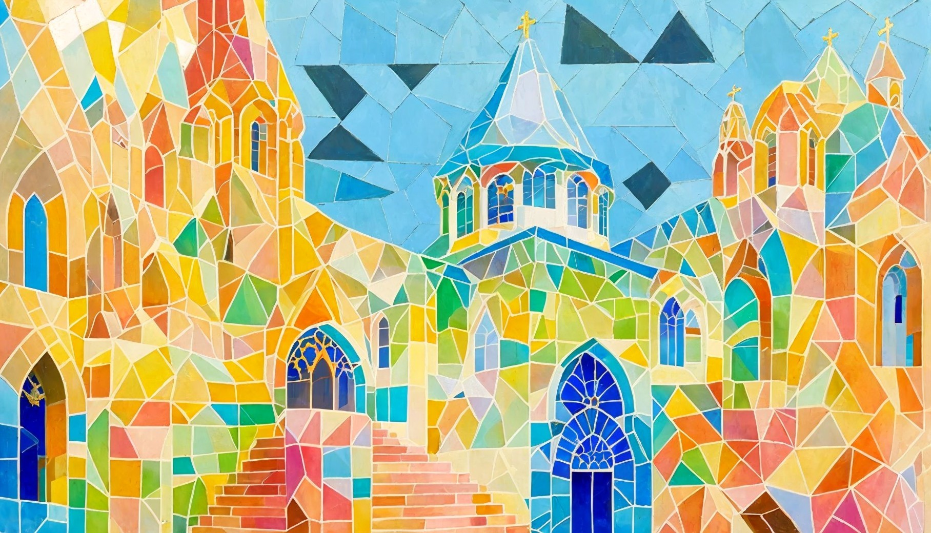A vibrant, geometric abstract painting depicting a cathedral with colorful, stained glass-like patterns.