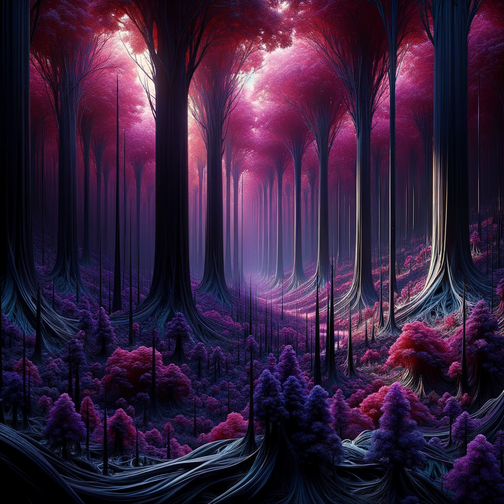 A mystical purple forest with tall trees and a soft glow, creating a dreamlike atmosphere.