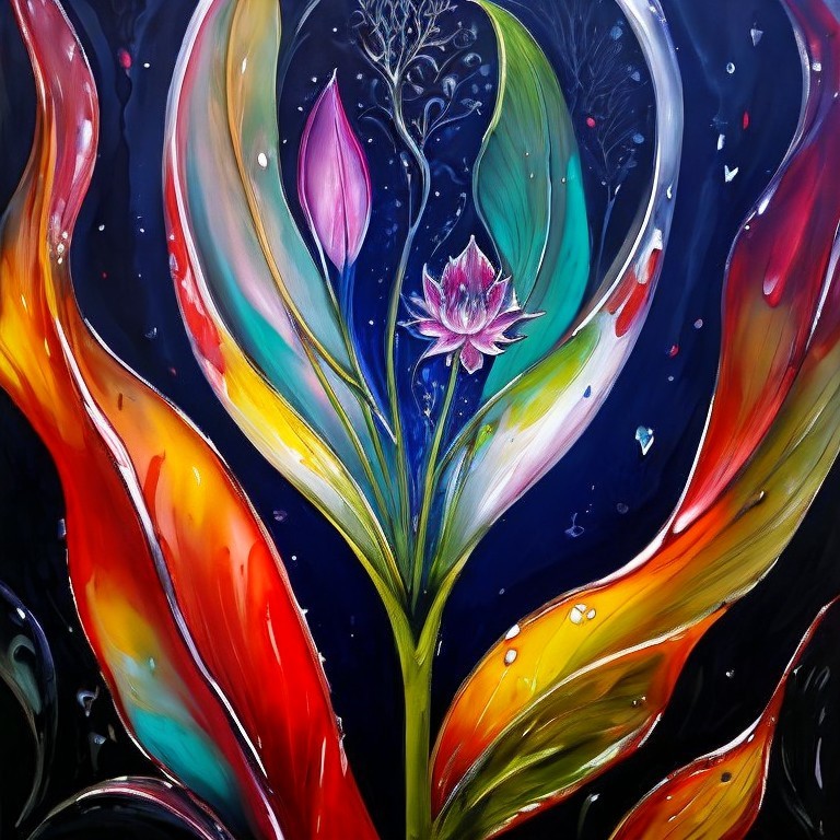Prompt: "magical acrylic and Ink flow wet-in-wet painting of a carnivorous lilly in a moonlit night, with alcohol spills by Aubrey Beardsley and Aaron Horkey, highly detailed scary petals, with long transparent stamens in the middle of the flower with teeth at the outer end, intricately detailed fluid acrylic dutch pour painting in black and all shades of red from dark violet to bright orange, golden voronoi pattern and lattice mesh circles overlay by Yayoi Kusama, watercolor art, award winning photography, dynamic lighting, splash art, golden splatter, sparks, concept art, metallic crimson patina, paper quilling art in the style of Amy Genser, intricately detailed, complex, elegant, expansive, focus on textures ©Susanne, vibrant colours, high contrast, soft dark background, eerie volumetric lighting"