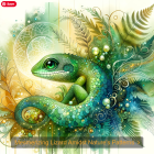 A vibrant green lizard nestled among lush ferns and leaves, adorned with decorative swirls and pearls. Its intricate scales shimmer, creating a harmonious blend of nature and artistry.