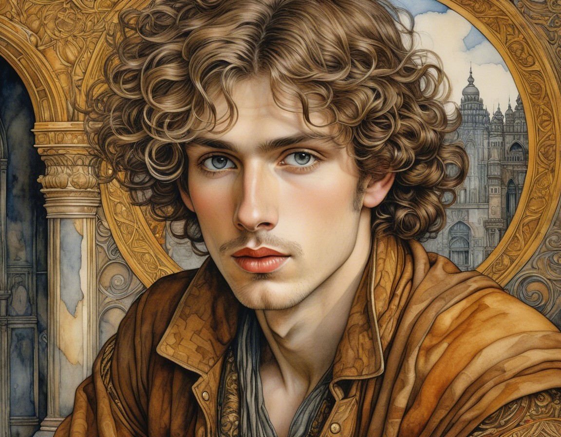 A young man with curly hair and striking features wears an ornate headscarf and rich clothing. He gazes thoughtfully, set against a backdrop of historic architecture and the sea.