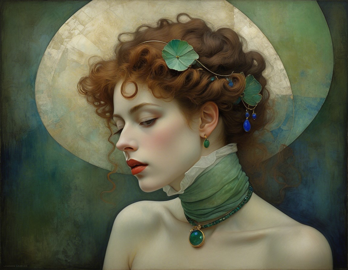 A portrait of a woman with elegant curls adorned with flowers, wearing a green silk scarf and jeweled accessories. The soft color palette and halo-like background add a serene, ethereal quality.