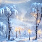 A surreal landscape features luminous trees and a giant, colorful moon. The vibrant hues of blue and purple reflect in a tranquil river, creating a dreamlike atmosphere filled with whimsy.