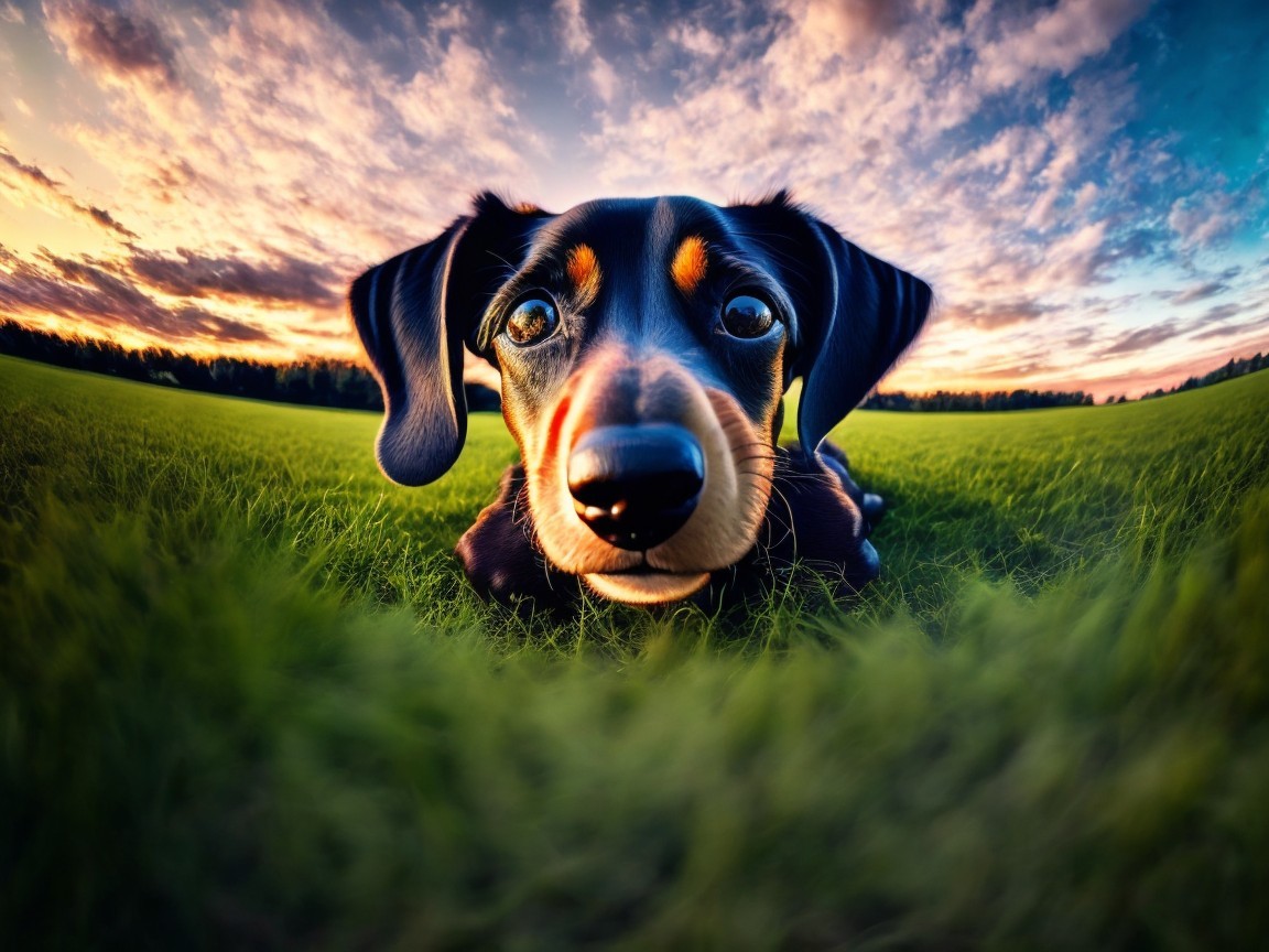 (Try from Fire Hot Indeed) - A close-up of a dog with big, expressive eyes lies on green grass, set against a colorful sky. Text emphasizes the dog's role in alleviating stress and drama.