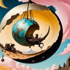 A samurai stands poised with a sword, wearing traditional armor. Above him, a large, intricately designed orb drips with water, revealing a serene landscape within, blending nature and artistry.
