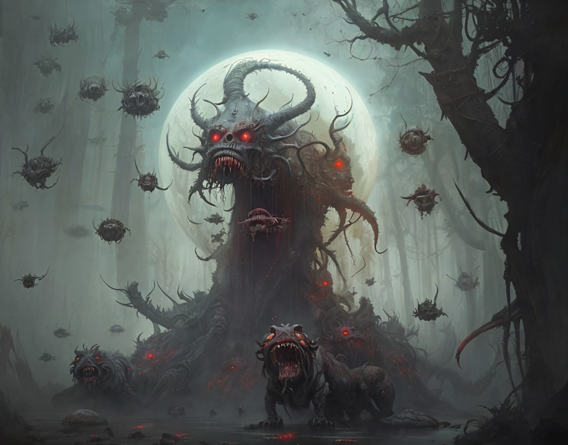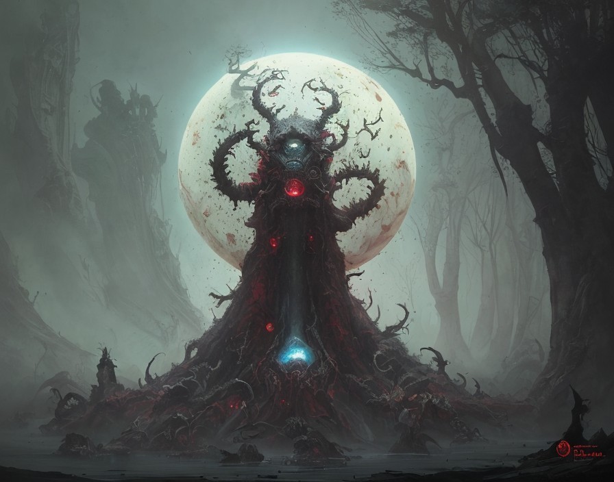 A mystical creature with a red-eyed crow's head, adorned with gold chains and surrounded by dark trees and floating orbs.