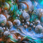 This vibrant abstract artwork features swirling patterns of rich colors like deep blues, fiery reds, and golds, intertwined with orbs and intricate textures, creating a cosmic, otherworldly effect.
