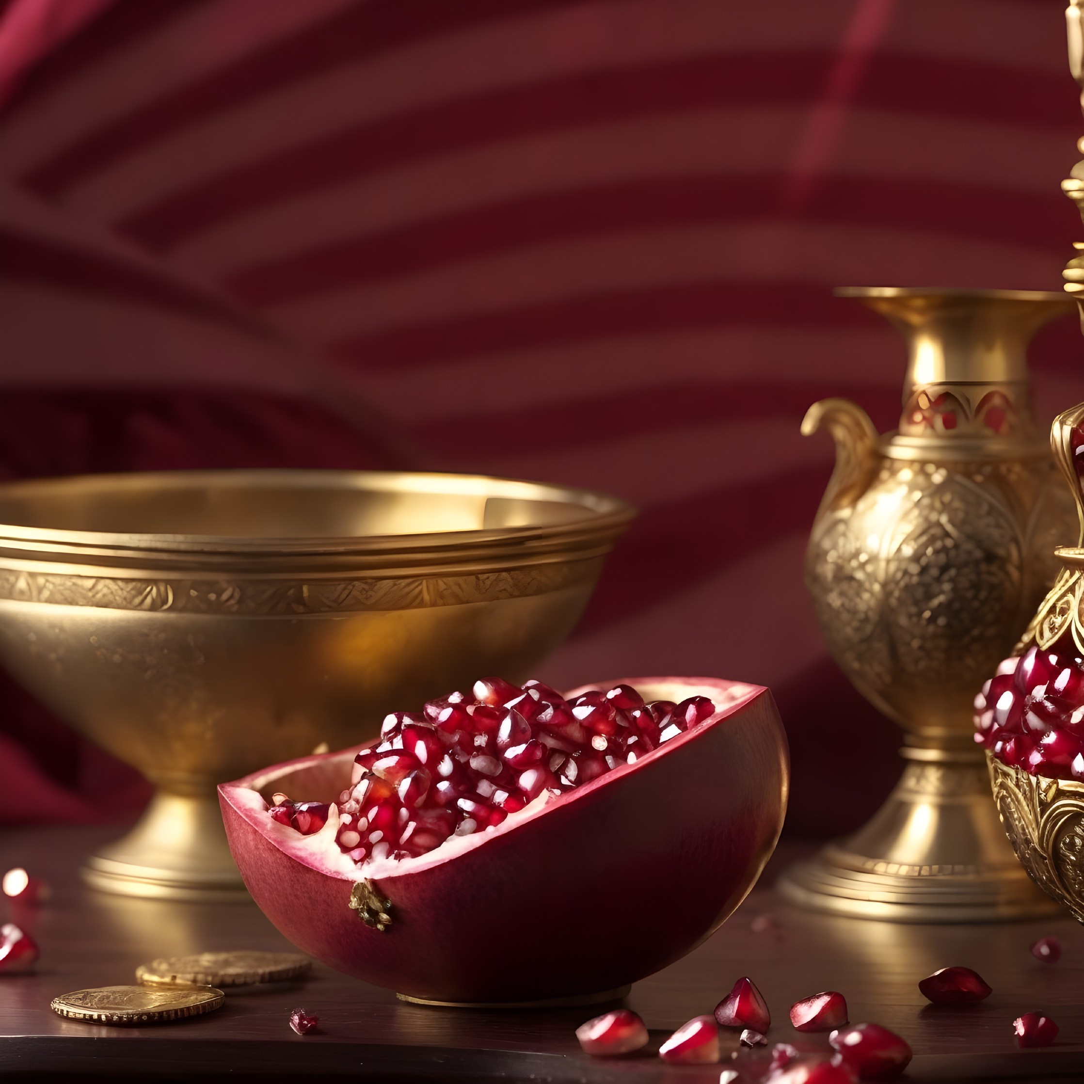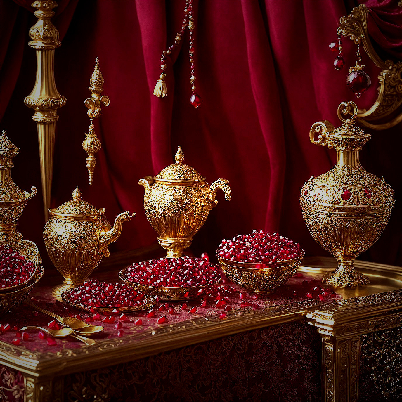 Ornate bowls with red cherries on a lavish table, with red curtains and intricate gold detailing in the background.