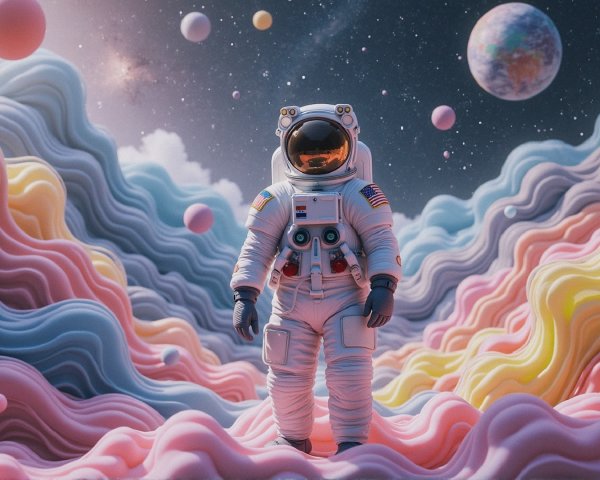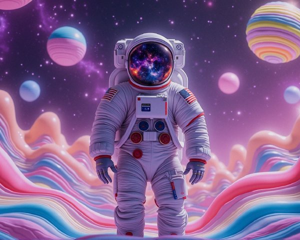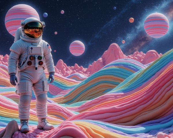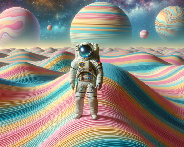 A group of astronauts walks across a surreal alien landscape, with vibrant planets and a galaxy filled with swirling stars overhead, illuminated by a setting sun on the horizon.
