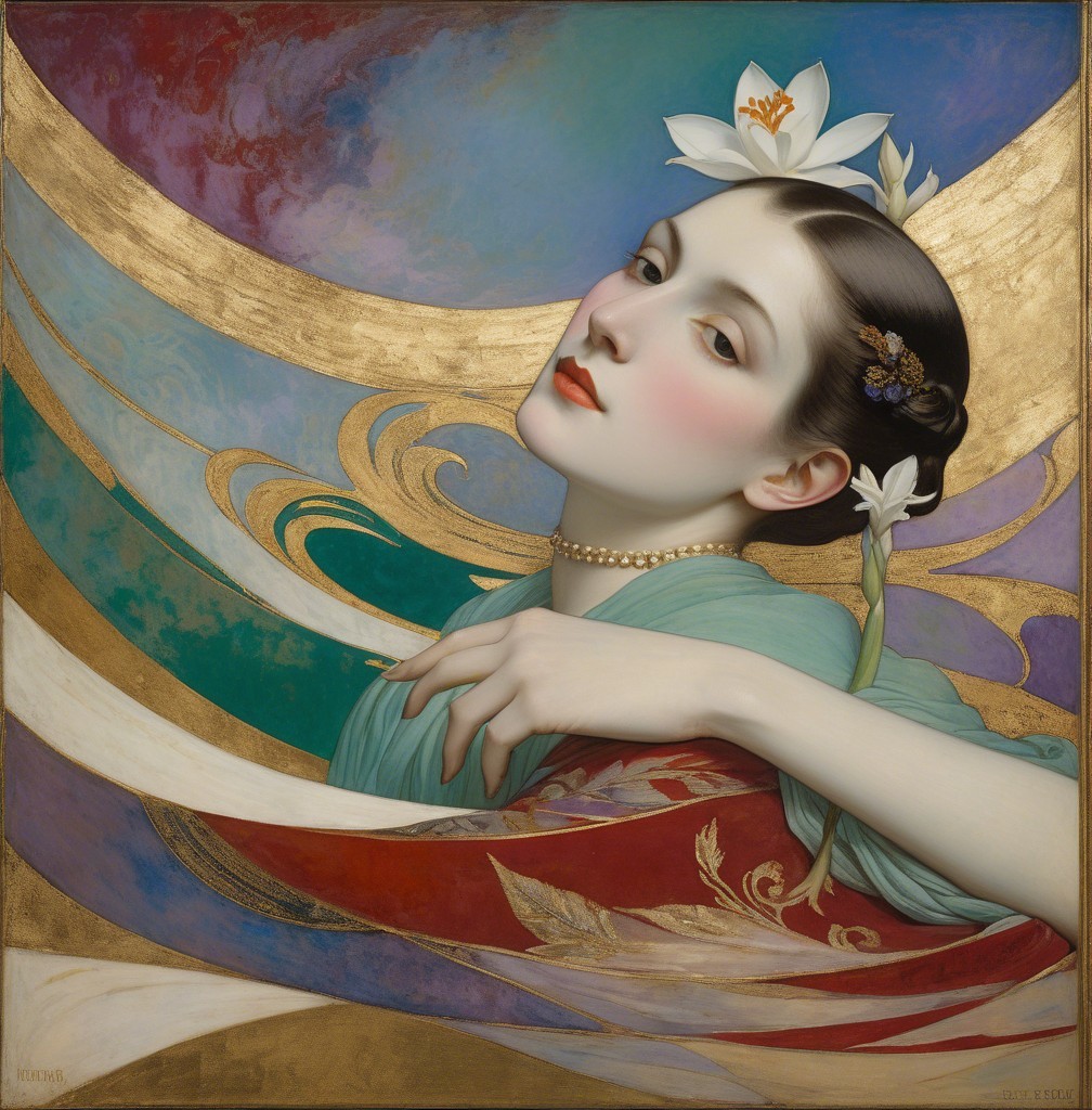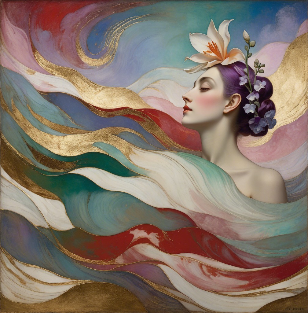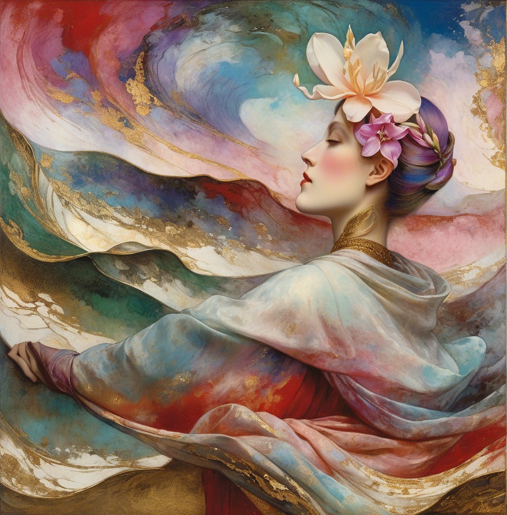 The artwork features a graceful woman with a serene expression, adorned with flowers in her hair. Rich colors and flowing patterns create an elegant, harmonious background, evoking a sense of beauty.