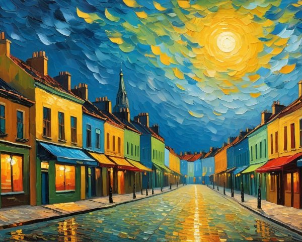 A picturesque fairytale castle nestled among golden autumn trees beside a gentle river flowing through the valley. The castle’s green towers rise elegantly against a backdrop of majestic mountains. Warm orange, yellow, and red hues fill the landscape, creating a serene and magical atmosphere. This vibrant painting captures the charm of a peaceful fantasy world in the heart of autumn.