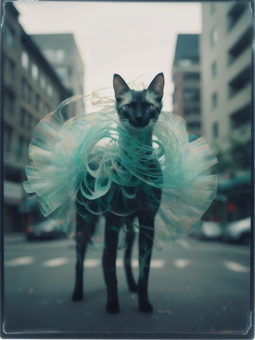 Prompt: "Extremely Cheesily Drawn Damaged Translucent Organic Polaroid Lifts of Secret of A swirling vortex of twisting forms, layered strokes, and distorted anatomy, reminiscent of Léo Forest's feline artworks, with a mesmerizing, abstracted realism, as if creating reality through kinetic energy, amidst a desolate, post-apocalyptic cityscape with soft focus, blending vintage photography, glitch, and optical illusions, inspired by Jim Henson, Benetton, Syd Mead, and H.R. Giger's styles, with a mix of red and black digital noise, in a stylized, exaggerated manner, similar to Massive Face Art's digital style."