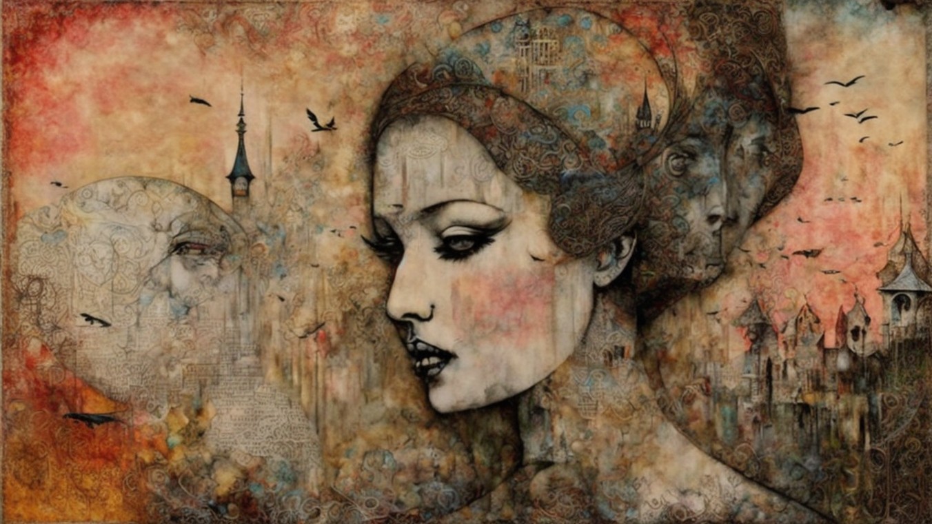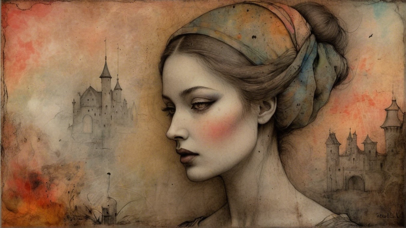 A stylized portrait of a woman with a colorful headscarf, surrounded by whimsical castles and a serene seascape featuring ships, blending fantasy and artistry in soft tones.