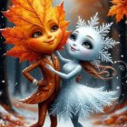 A whimsical couple dances in a snowy forest. One character, adorned with a large autumn leaf, wears a sparkling suit, while the other, with snowflake accents, sports a shimmering blue dress.