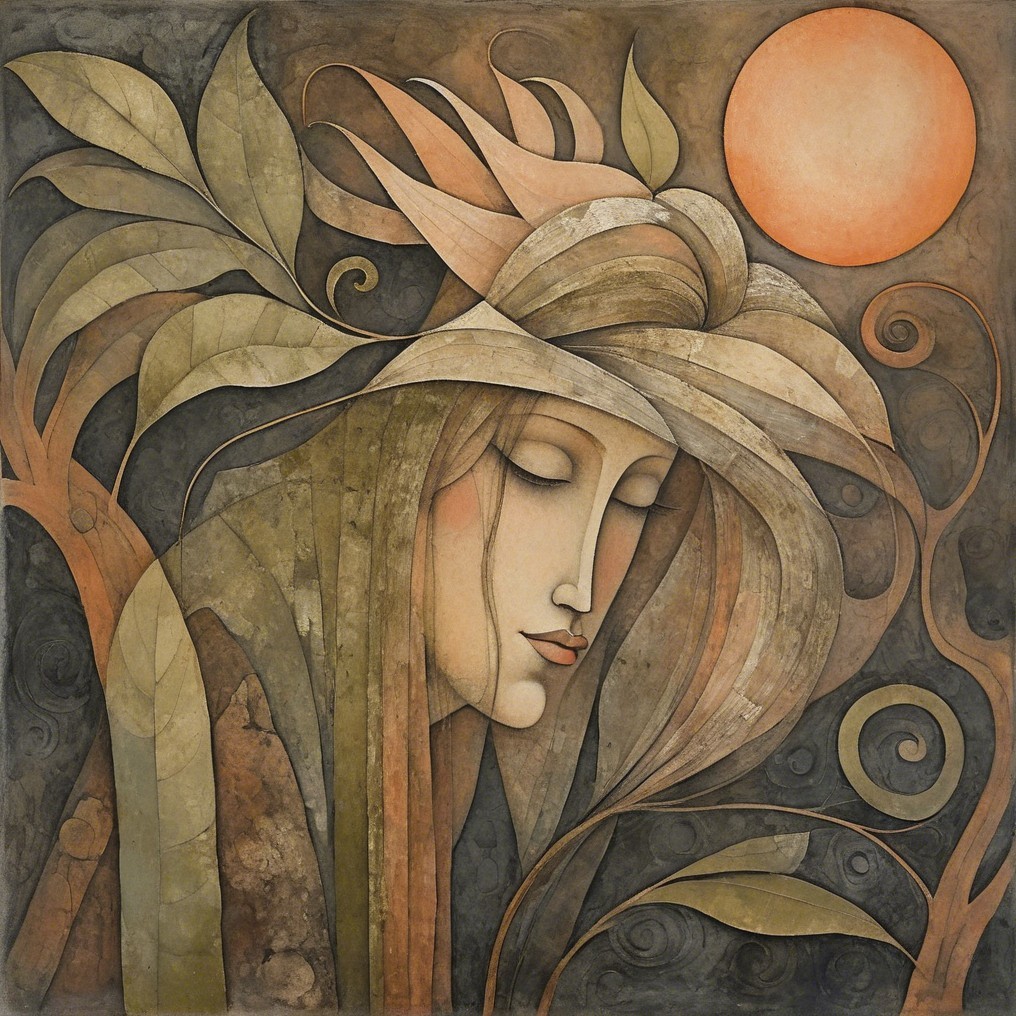A serene woman adorned with leaves and a stylish hat gazes thoughtfully, surrounded by celestial elements like the sun and abstract forms, creating a mystical atmosphere.