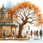 A charming bookstore nestled under autumn trees, with vibrant leaves in shades of orange. Passersby stroll along the path, creating a cozy atmosphere in a scenic, serene setting.