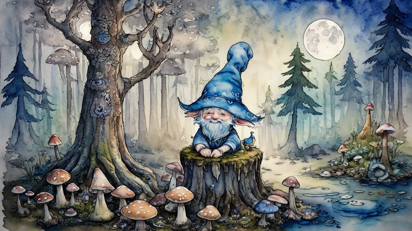 A whimsical gnome with a blue hat sits cheerfully on a mossy log, surrounded by vibrant mushrooms in a serene forest illuminated by a glowing moon. A magical, enchanting scene unfolds.