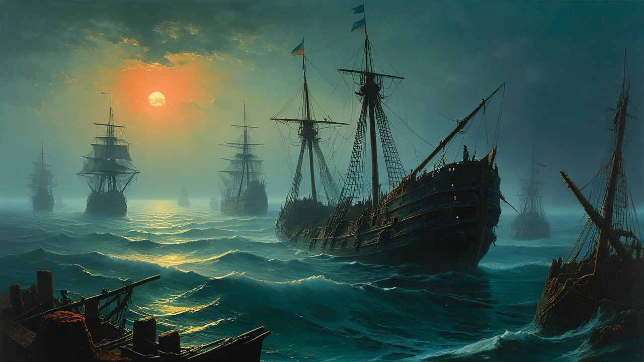 A fleet of ancient wooden sailing ships with tall masts, some with torn sails, are in the middle of a choppy, dark teal ocean illuminated by a large, bright orange full moon or sun in the background. The sky is dark blue and cloudy. Some of the ships in the foreground are partially submerged