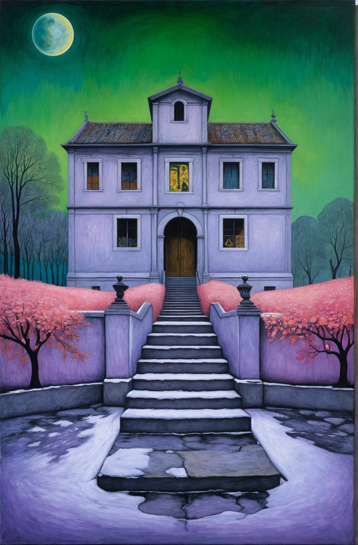A figure walks up a stone pathway towards a large, purple-tinted house, illuminated by a warm yellow light. The landscape features vibrant green skies and a moon overhead, adding to the surreal atmosphere.