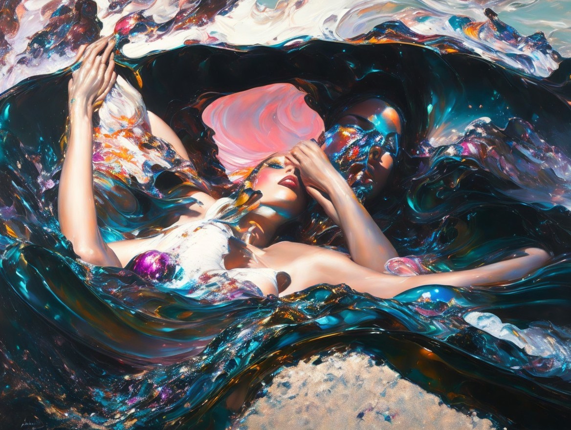 Masterpiece, best quality, Beautiful Woman appearing from colorful liquid oil paint, swirling paint