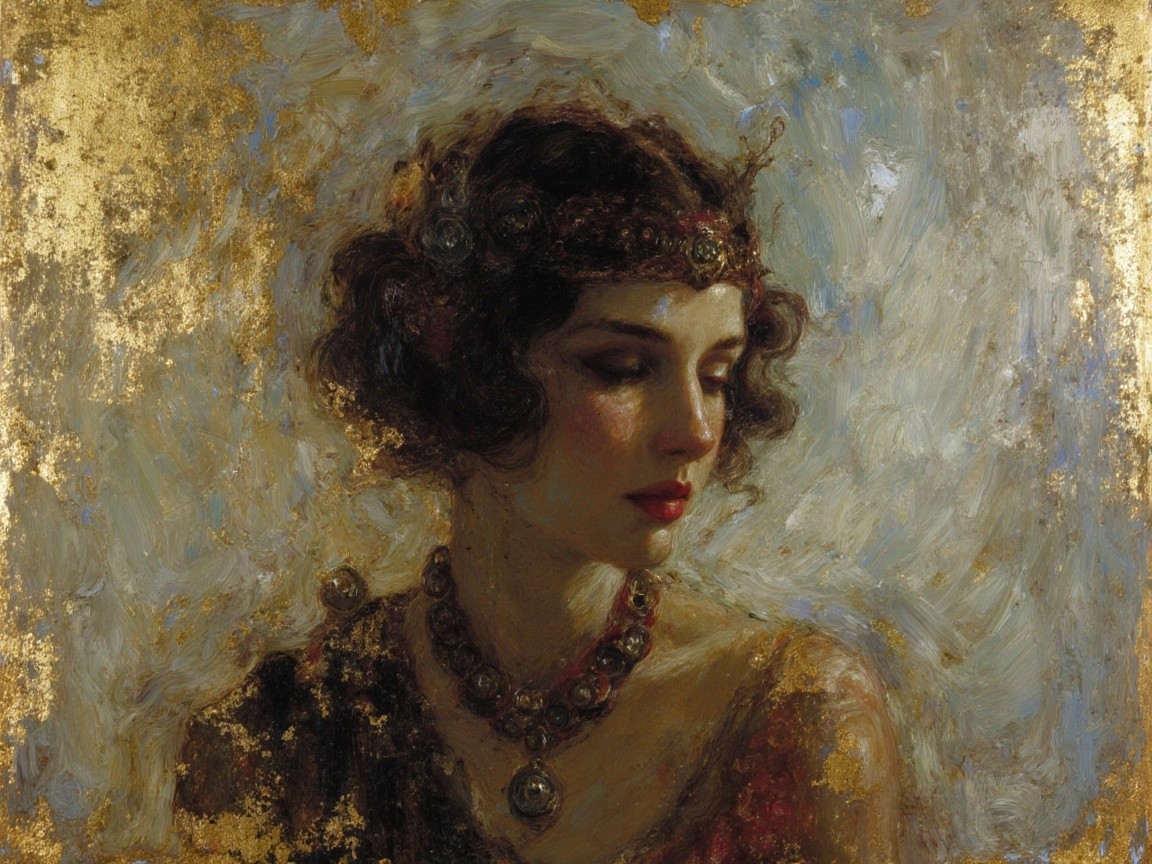 A joyful older woman sits by a serene lake, surrounded by tall grass and purple flowers. Her warm smile radiates happiness, framed by flowing hair adorned with blossoms, creating a peaceful atmosphere.