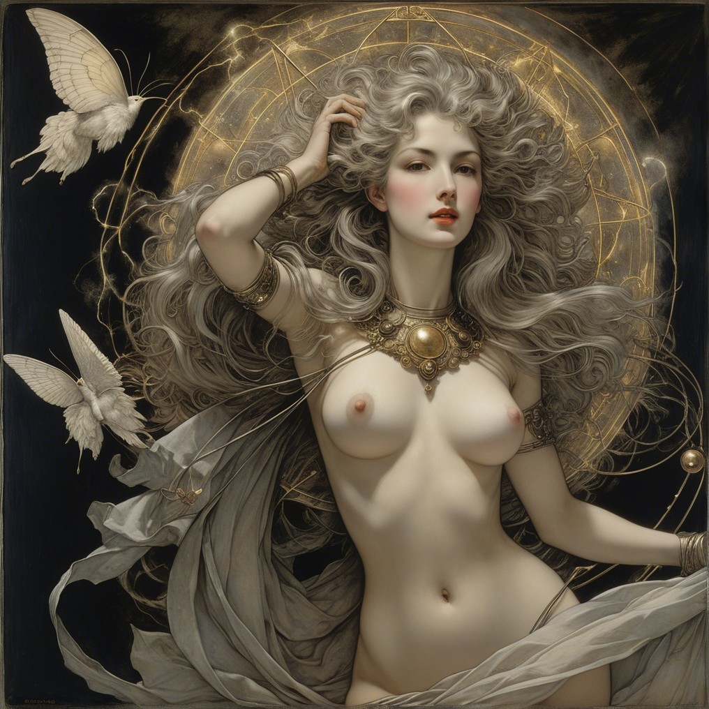 A mystical figure with flowing hair, seated against a cosmic backdrop. She holds a spear, embodying beauty and strength, as celestial bodies illuminate the dark, starry space around her.